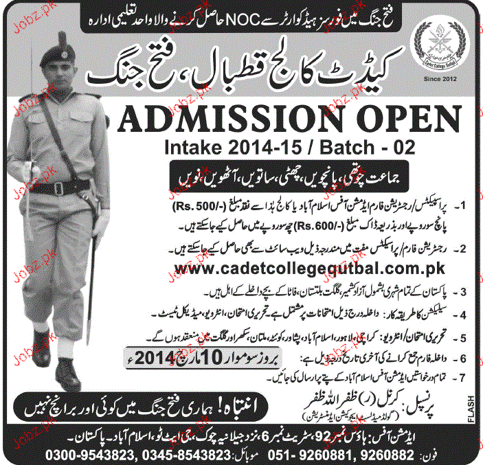 Cadet College Qutbal Admission in Class IV to IX in Qutbal Read newspaper ad for exact details.