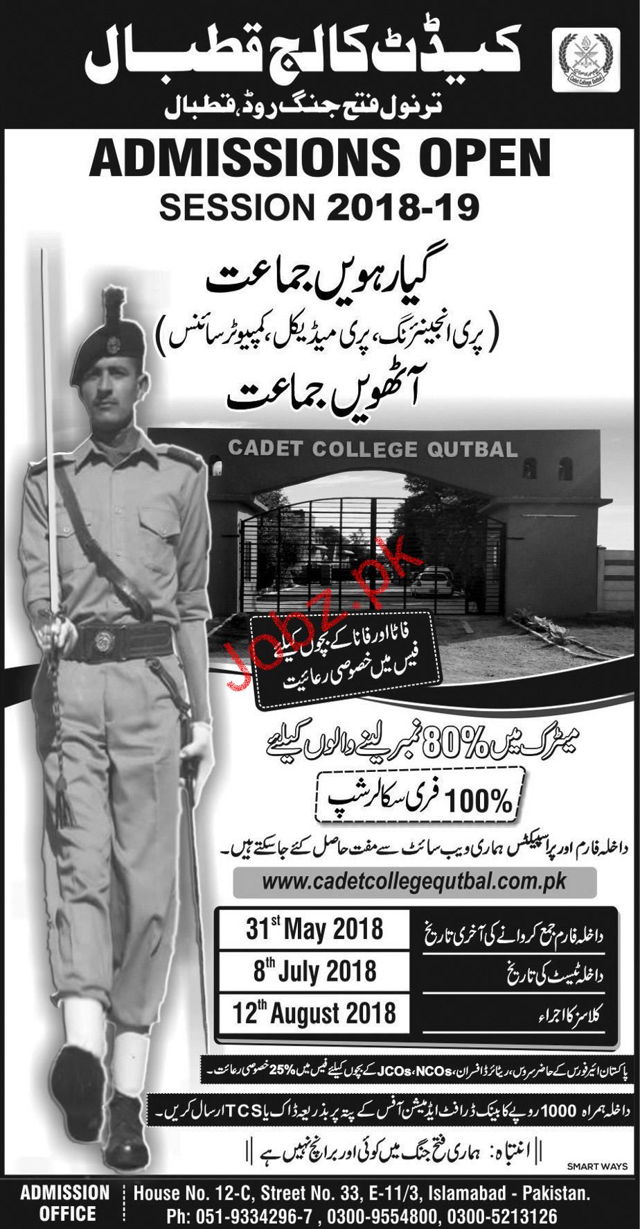 Cadet College Qutbal Fateh Jhang Admission in Class XI in Fateh Jhang. Last date for submission of admission forms is 31 May 2018. Admission test will be held on 08-07-2018. Read newspaper ad for exact details.
