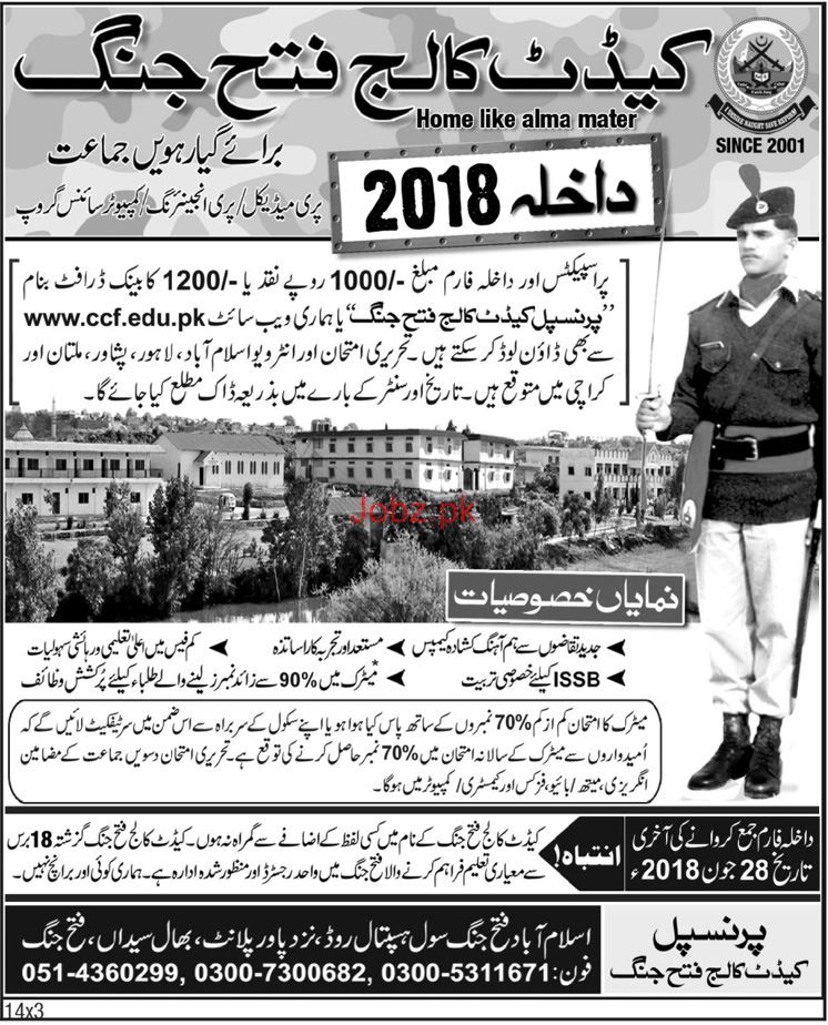 Cadet College Qutbal Fateh Jhang Admission in Class XI Pre Medical, Pre Engineering and Computer Science Group in Fateh Jhang. Academic Session 2018-2019. Read newspaper ad for exact details.