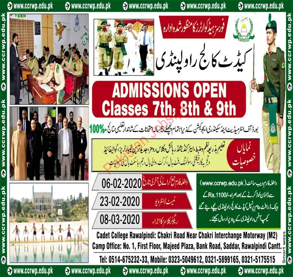 Cadet College Rawalpindi established by Pakistan Army invites application for Admissions 2020 in Class 7th, Class 8th and 9th Class in Rawalpindi. Last date of Submission of Admissions form is February 06th, 2020. Read newspaper ad for exact details.