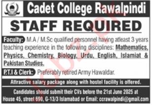 Cadet College Rawalpindi CCR Islamabad, islamabad Islamabad Pakistan invites applications from eligible candidates for the post of biology teacher, english teacher, pti, islamiat teacher, urdu teacher, clerk, maths teacher, physics teacher, pakistan studies teacher and chemistry teacher as per advertisement of June 15, 2025 published in daily Jang Newspaper. Preferred Education is Bachelor, Master and MS etc.