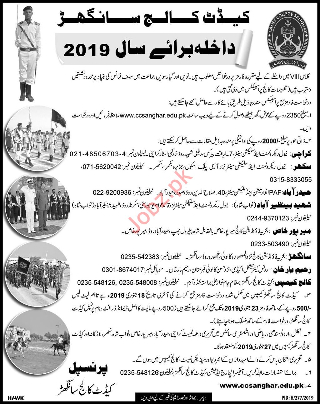 Cadet College Sanghar is a military high school, located near the town of Jam Nawaz Ali in Sanghar District, Sindh, Pakistan starts admissions in 8th Class for session 2018-2019. Read newspaper ad for exact details.