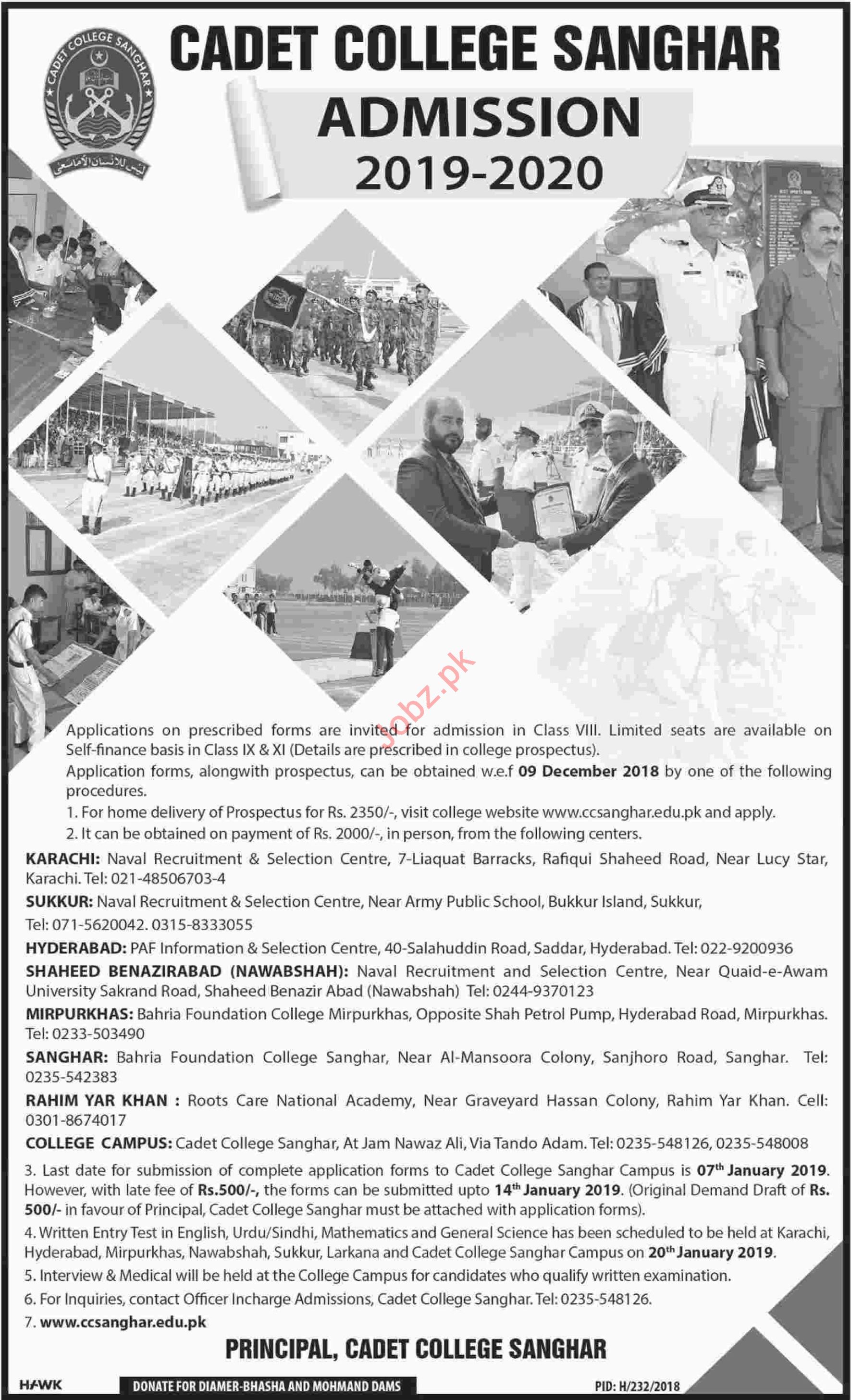 Cadet College Sanghar, Pakistan Army, Pakistan are announced admissions spring 2019 to 2020 for the classes of Class 8. Last Date of Submission of Application Form January 7, 2019. Read newspaper ad for exact details.