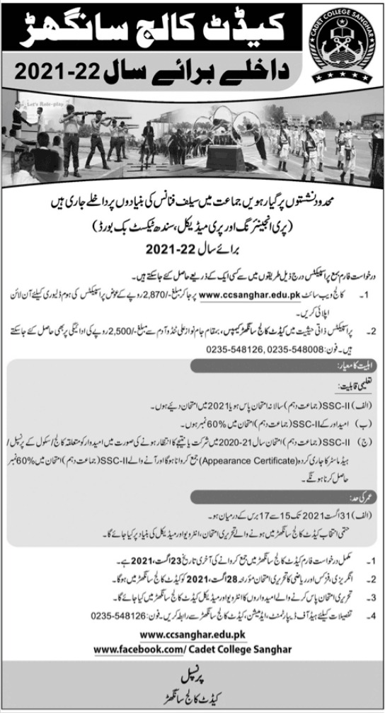 Cadet College is a special military school system has announced admissions in Class XI Pre Engineering & Pre Medical in Sanghar District Sindh Pakistan 2021. Read newspaper ad for exact details.