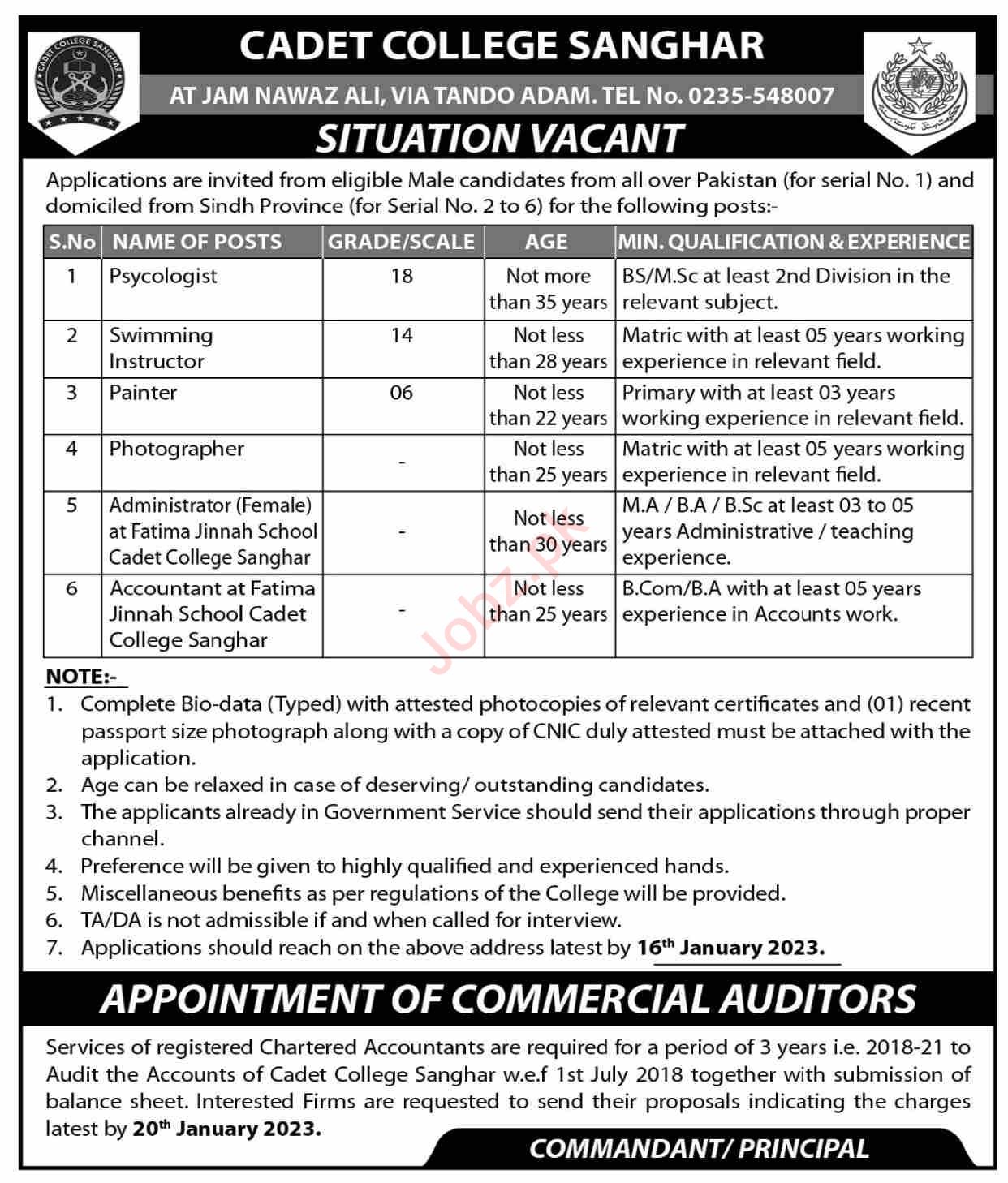 Vacancies in Cadet College Sanghar Advertisement January 2023
