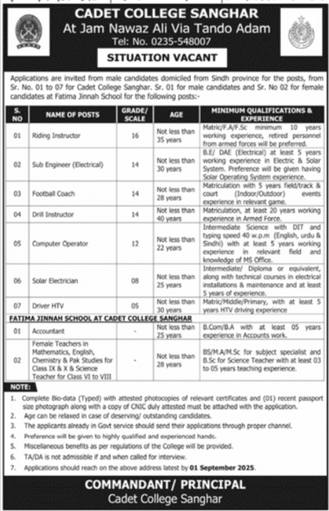 Cadet College Sanghar is looking for candidates for following posts as per job advertisement published in daily Jang Newspaper of August 25, 2025 for location Sanghar, sanghar Sindh Pakistan: