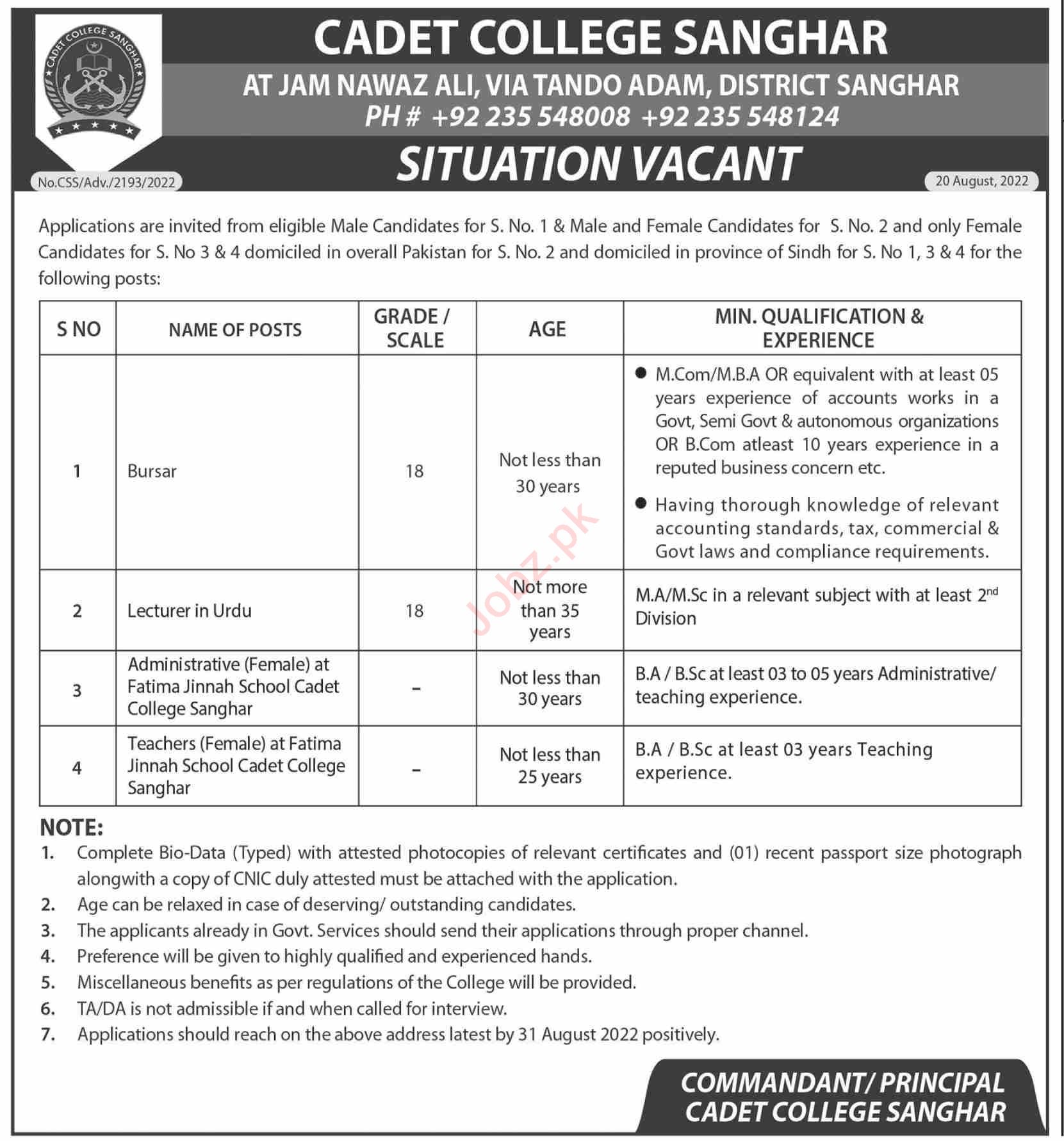 Vacancies in Cadet College Sanghar Advertisement August 2022