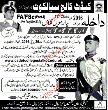 Cadet College Sialkot Admission in Class VI to IX in Sialkot. Read newspaper ad for exact details.