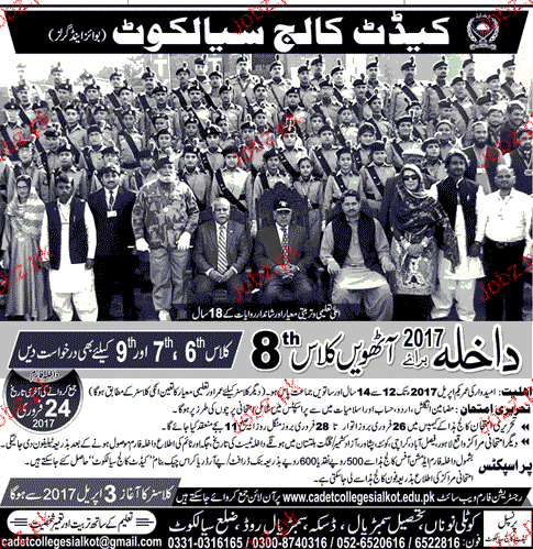 Cadet College Sialkot Admission in Class VI to IX in Sialkot. Read newspaper ad for exact details.