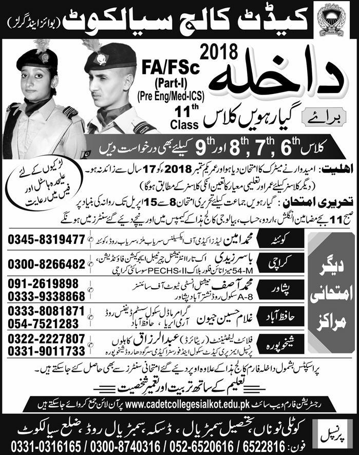 Cadet College Sialkot For Boys and Girls Admission in Class Class VI to Class IX in Sialkot. Admission test will be held from 08 April to 15 April 2018 on daily basis. Read newspaper ad for exact details.