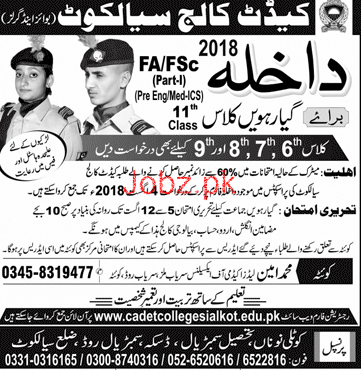 Cadet College Sialkot For Boys and Girls Admission in Class XI Pre Medical, Pre Engineering & Computer Sciences, Class VI, Class VII, Class VIII and Class IX in Sialkot. Read newspaper ad for exact details.