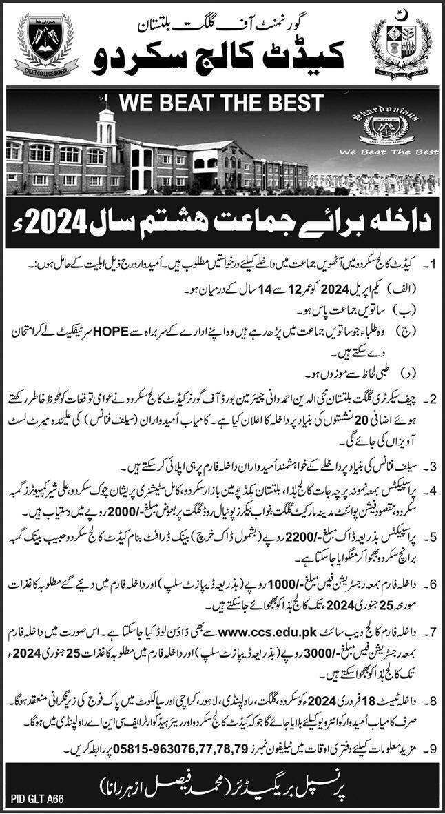 Cadet College Skardu Class 8th admissions 2023 has been started. Cadet College Skardu Rawalpindi Punjab Pakistan welcomes students to apply for admissions in academic year 2023 in Science School. Eligible students for fulfilling criteria for admissions in Middle and Phd can enroll as per Government admission policy 2023 till closing date 25 January 2024. Read newspaper ad for exact details.