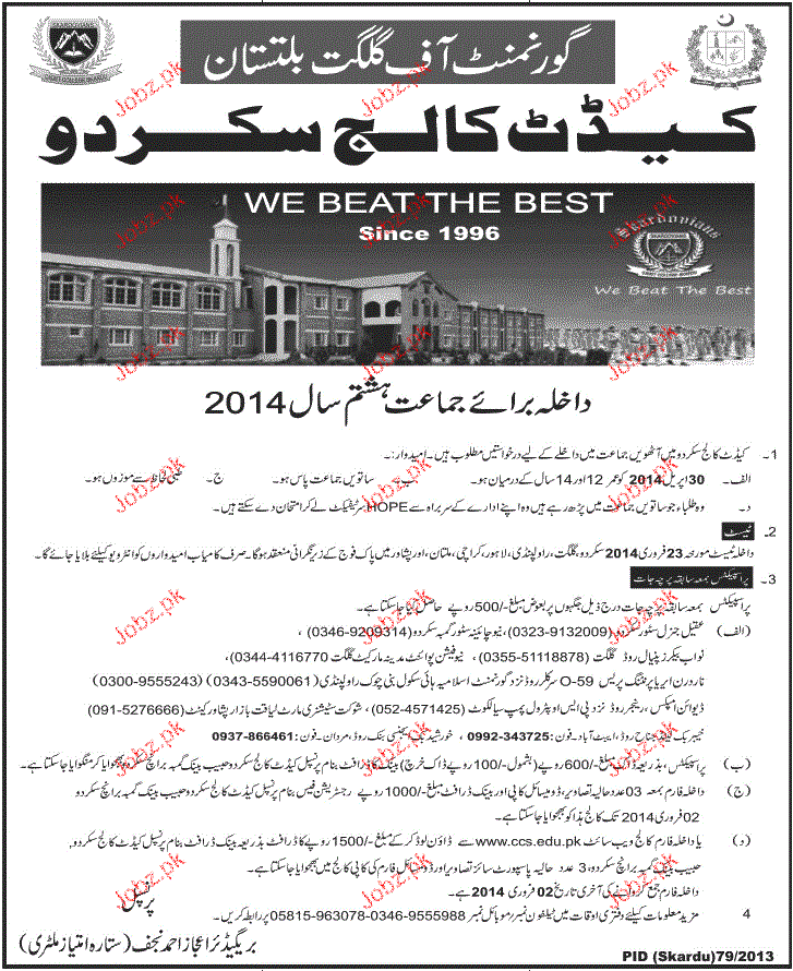 Cadet College Skardu Admission in Class VIII in Skardu Read newspaper ad for exact details.