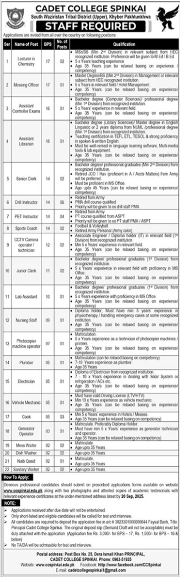 Cadet College Spinkai South Waziristan, south waziristan Khyber Pakhtunkhwa KPK Pakistan invites applications from eligible candidates for the post of cctv camera technician, sanitary worker, dish washer, clerk, assistant librarian, cctv camera operator, photocopier machine operator, mess waiter, messing officer, generator operator, pet instructor, lecturer, lab assistant, drill instructor, naib qasid, lecturer chemistry, ltv driver, sports coach, nursing staff, plumber, electrician, htv driver, assistant controller exams and vehicle mechanic as per advertisement of September 8, 2025 published in daily The News Newspaper. Master, Intermediate, DAE, M.sc, Primary, Others, Bachelor, Matric and BA etc. educational qualification will be preferred.