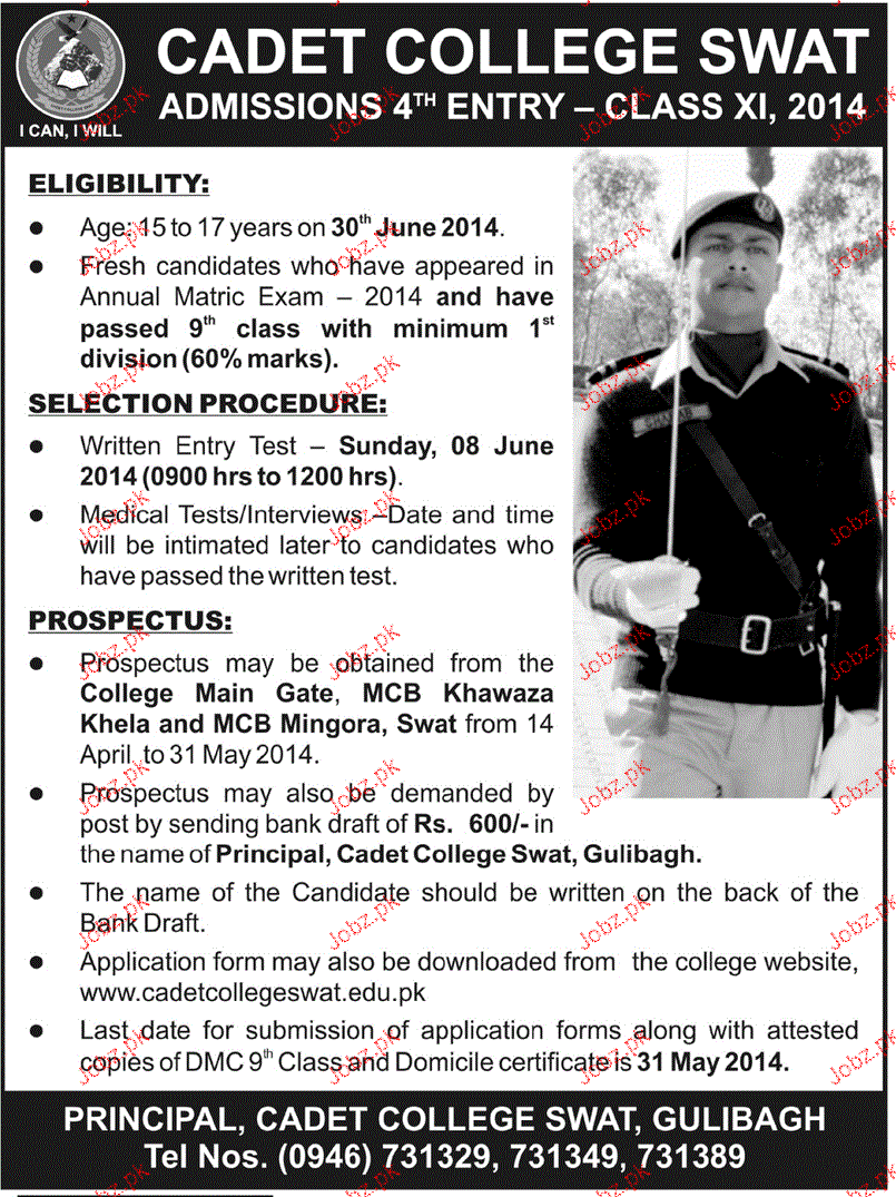 Cadet College Swat Admission in Class XI in Swat Read newspaper ad for exact details.