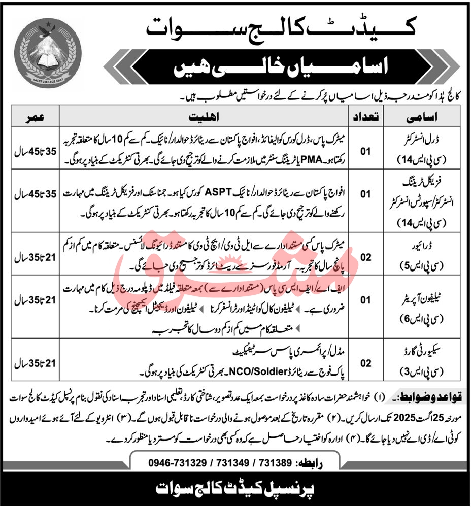 Vacant posts including drill instructor, sport instructor, telephone operator, driver, security guard and physical training instructor are announced in Cadet College Swat Swat, swat Khyber Pakhtunkhwa KPK Pakistan as per 8 August 2025 advertisement in daily Mashriq Newspaper. Educational qualifications required Middle, Matric and Intermediate etc.