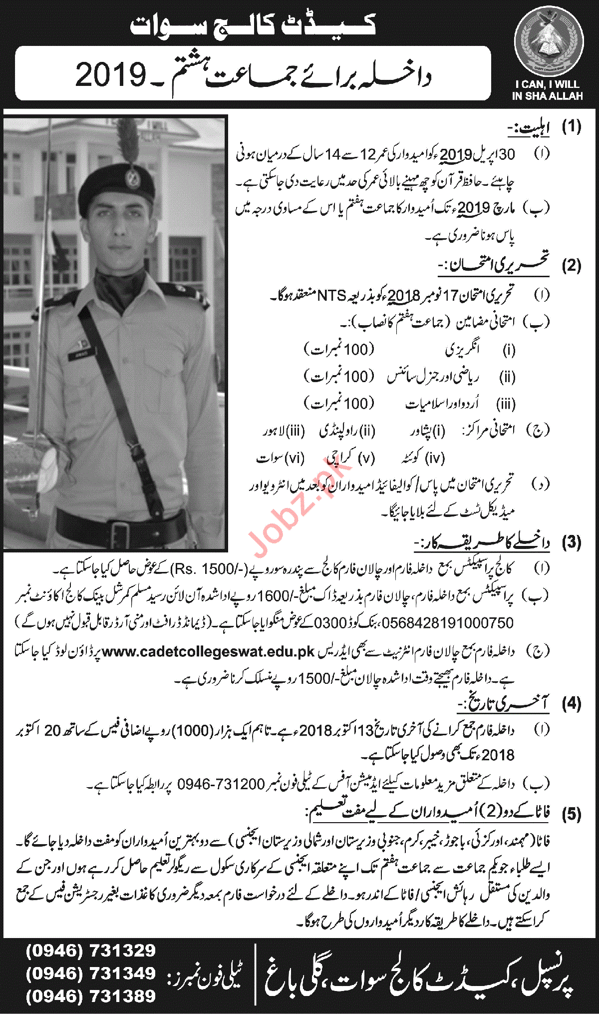 Government of Khyber Pakhtunkhwa KPK Cadet College is offering admissions for Class VI in Swat. Written test will be held on 17 November 2018 through NTS National Testing Services 2018. Read newspaper ad for exact details.