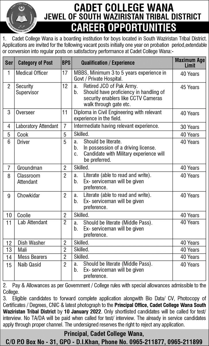Cadet College Wana established by Pakistan Army invites applications from qualified expert and experienced professionals for the post of Medical Officer, Security Supervisor, Overseer, Laboratory Attendant, Cook, Driver, Groundman, Classroom Attendant, Chowkidar, Coolie, Lab Attendant, Dish Washer, Mali, Mess Bearer, Naib Qasid in Wana South Waziristan.