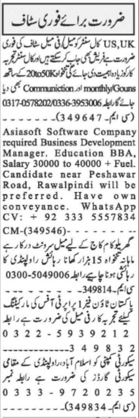Vacant posts including security guard, marketing officer, marketing staff, male servant, servant, business development manager and call center agent are announced in Private Company Islamabad, islamabad Islamabad Pakistan as per 26 February 2022 advertisement in daily Jang Newspaper. Intermediate, Bachelor, Matric and Middle etc. educational qualification will be preferred.