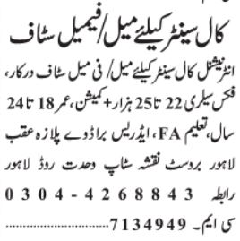 Call Center is looking for candidates for following posts as per job advertisement published in daily Jang Newspaper of July 12, 2023 for location Lahore, lahore Punjab Pakistan: