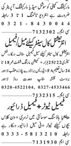 Private Company Lahore, lahore Punjab Pakistan invites applications from eligible candidates for the post of driver, female tutor, call center agent, female driver, social media marketing operator, ltv driver and tutor as per advertisement of May 3, 2023 published in daily Jang Newspaper. Educational qualifications required BA, Intermediate, Bachelor, Middle and Matric etc.