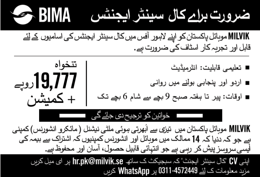 Latest Milvik Mobile Pakistan Call Center Posts Lahore 2025