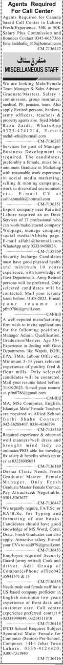 Private Company Lahore, lahore Punjab Pakistan invites applications from eligible candidates for the post of team manager, sales advisor and call center agents as per advertisement of August 21, 2023 published in daily Jang Newspaper. Educational qualifications required Master and Bachelor etc.