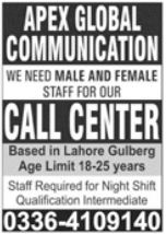 Latest Apex Global Communication Call Center Posts Lahore 2025
