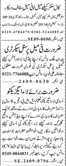 Private Company jobs advertisement dated about 25 September 2024 in daily Jang Newspaper invites application for the vacant post of personal secretary, law executive and call center staff in Lahore, lahore Punjab Pakistan. Candidates with Bachelor, Master, Intermediate and LLb etc. educational background will be preferred.