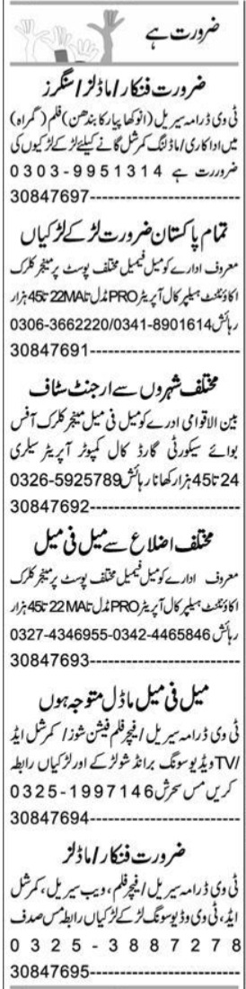 Vacant posts including actor, helper, pro, singer, accountant, clerk, call operator, manager, model, security guard, office boy and call computer operator are announced in Private Sargodha, sargodha Punjab Pakistan as per 4 April 2023 advertisement in daily Express Newspaper. Persons with Intermediate, Matric, Master, Middle and Bachelor etc. education can apply.