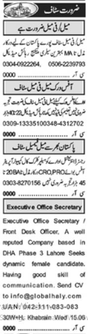 Private Company is looking for candidates for following posts as per job advertisement published in daily Khabrain Newspaper of June 16, 2022 for location Lahore, lahore Punjab Pakistan: