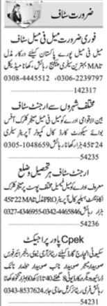 Vacant posts including office staff, office boy, accountant, security incharge, call computer operator, manager, clerk, pro, call operator, security guard, public relation officer, helper and driver are announced in Private Company Lahore, lahore Punjab Pakistan as per 5 April 2023 advertisement in daily Dunya Newspaper. Intermediate, Bachelor, Middle and Matric etc. educational qualification will be preferred.