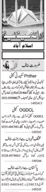 Private Company Islamabad, islamabad Islamabad Pakistan invites applications from eligible candidates for the post of office boy, security supervisor guard, clerk, supervisor, manager, subedar, sipahi, call operator, accountant, havaldar and naib subedar as per advertisement of September 14, 2024 published in daily Dunya Newspaper. Matric, Bachelor, B.com, BA, Middle and Intermediate etc. educational qualification will be preferred.