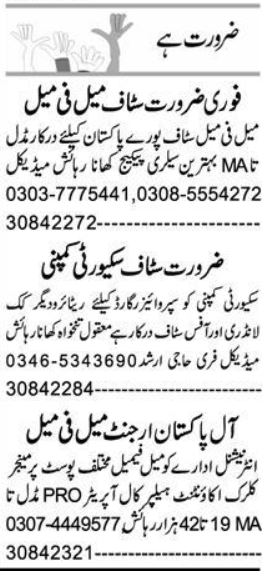 Private jobs advertisement dated about 31 January 2023 in daily Express Newspaper invites application for the vacant post of call operator, manager, cook, accountant, management staff, laundry staff, security guard, clerk, male female staff, helper, security supervisor, office staff and pro in Peshawar, peshawar Khyber Pakhtunkhwa KPK Pakistan. Persons with Master, Intermediate, Bachelor, Middle and Matric etc. education can apply.