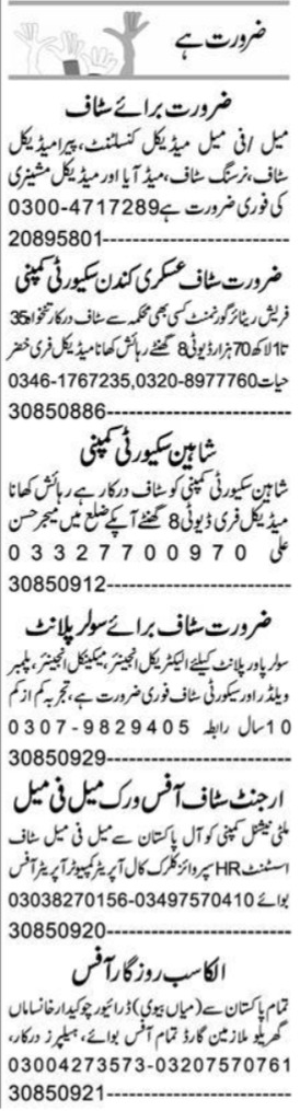 Private jobs advertisement dated about 19 May 2023 in daily Express Newspaper invites application for the vacant post of male female staff, welder, helper, assistant, hr supervisor, office boy, plumber, maid, security guard, medical consultant, call operator, chowkidar, aya, clerk, computer operator, electrical engineer, nursing staff, retired government staff, khansama, mechanical engineer, paramedical staff, driver, security staff and house servant in Sargodha, sargodha Punjab Pakistan. Persons with MBBS, Matric, Master, Bachelor, Intermediate and Others etc. education can apply.