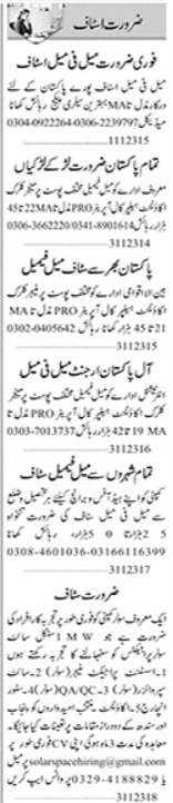 Private Karachi, karachi Sindh Pakistan invites applications from eligible candidates for the post of management staff, manager, call operator, office staff, site supervisor, clerk, assistant project manager, male female staff, pro, helper, store incharge, qa qc manager and accountant as per advertisement of January 31, 2023 published in daily Dunya Newspaper. Intermediate, Middle, Master, Matric and Bachelor etc. educational qualification will be preferred.