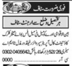 Private Company jobs advertisement dated about 28 November 2023 in daily Khabrain Newspaper invites application for the vacant post of manager, office boy, field worker, clerk, call operator, accountant and supervisor in Lahore, lahore Punjab Pakistan. B.com, Matric, Middle, I.com, Intermediate and Bachelor etc. educational qualification will be preferred.