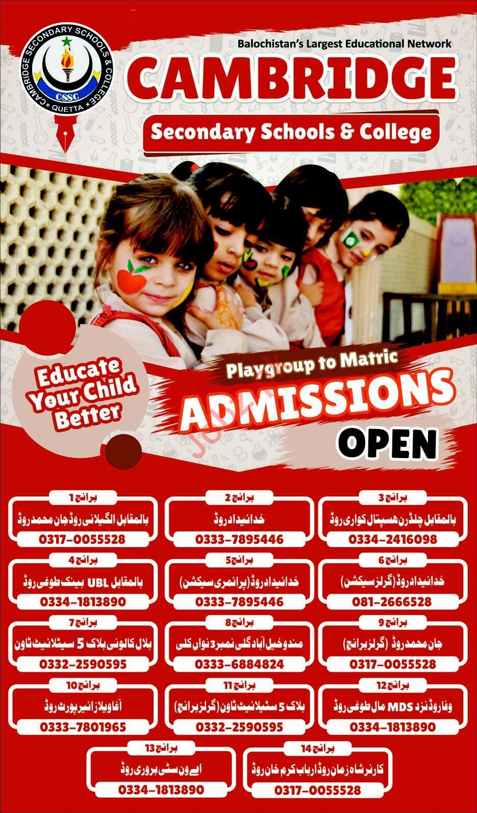 Balochistans largest Educational Network Cambridge Secondary Schools & College is offering admissions for Play Group, Class I, Class II, Class III, Class IV, Class V, Class VI, Class VII, Class VIII, Class IX and Matric. Read newspaper ad for exact details.