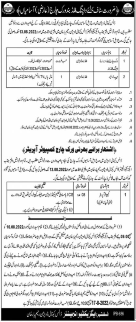 Vacant posts including computer operator are announced in Canal Division Rahim Yar Khan, rahim yar khan Punjab Pakistan as per 7 August 2022 advertisement in daily Nawaiwaqt Newspaper. Educational qualifications required Intermediate etc.