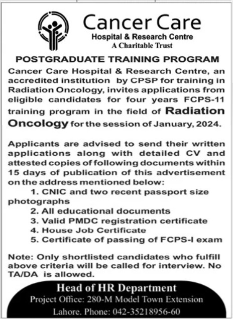 Cancer Care Hospital & Research Center Lahore, lahore Punjab Pakistan invites applications from eligible candidates for the post of postgraduate training program and radiation oncology post graduate trainee as per advertisement of December 7, 2023 published in daily Jang Newspaper. Others, MBBS and P.G Diploma etc. educational qualification will be preferred.