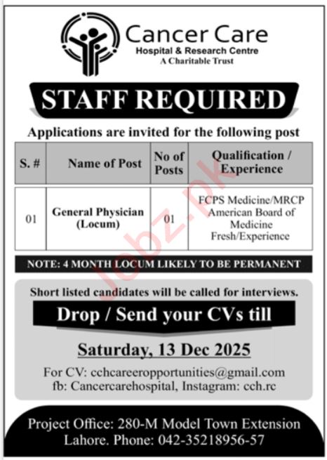 Cancer Care Hospital & Research Center invites applications for job positions advertised in daily Jang dated 30 November 2025 for following vacancies in Model Town Lahore, lahore Punjab Pakistan.