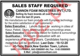 Cannon Foam Industries Lahore Jobs 2020 for Sales Staff