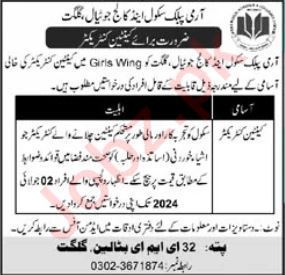 Army Public School & College APS&C Gilgit, gilgit Gilgit Baltistan Pakistan invites applications from eligible candidates for the post of canteen contractor as per advertisement of June 30, 2024 published in daily K2 Newspaper. Candidates with Bachelor and Intermediate etc. educational background will be preferred.