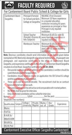 Latest Cantonment Board Teaching Posts Sargodha 2025
