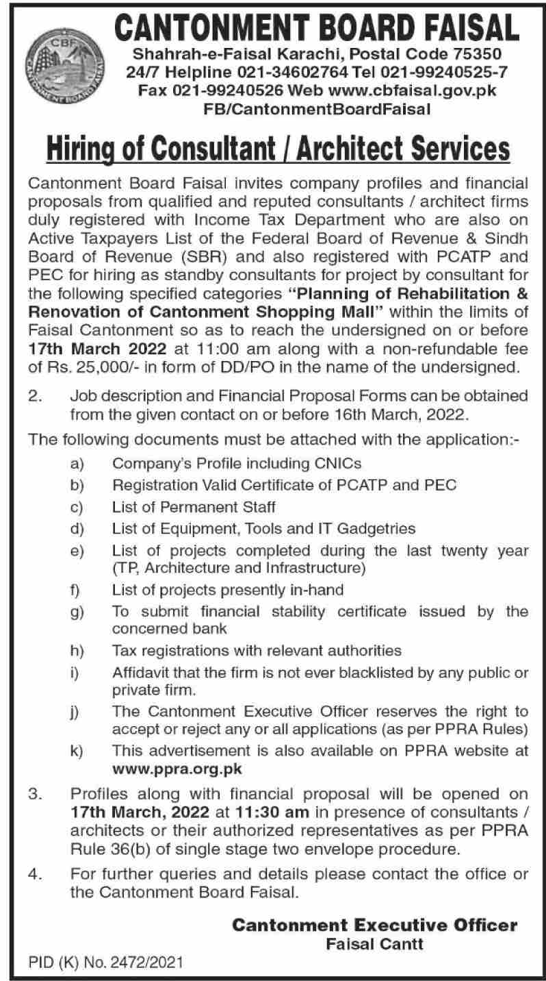 Cantonment Board Karachi, karachi Sindh Pakistan invites applications from eligible candidates for the post of architect and consultants as per advertisement of February 27, 2022 published in daily Dawn Newspaper. Master and Bachelor etc. educational qualification will be preferred.