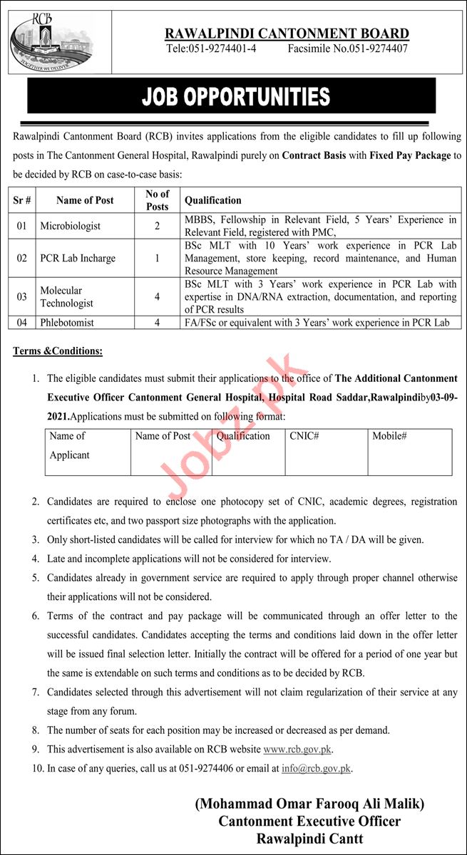 Vacancies in Rawalpindi Cantonment Board RCB Advertisement August 2021
