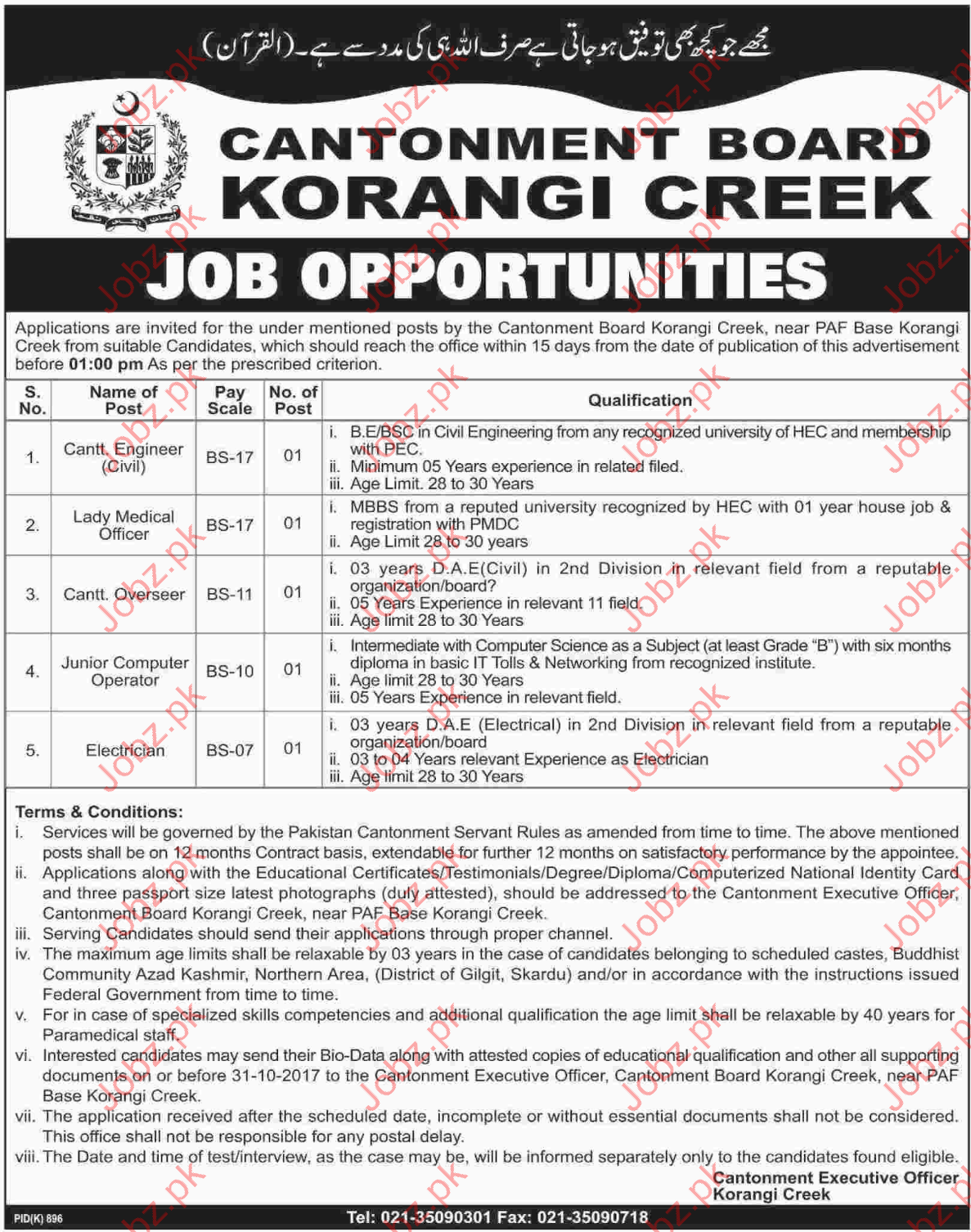 Latest Cantonment Board Engineering Posts Karachi 2025