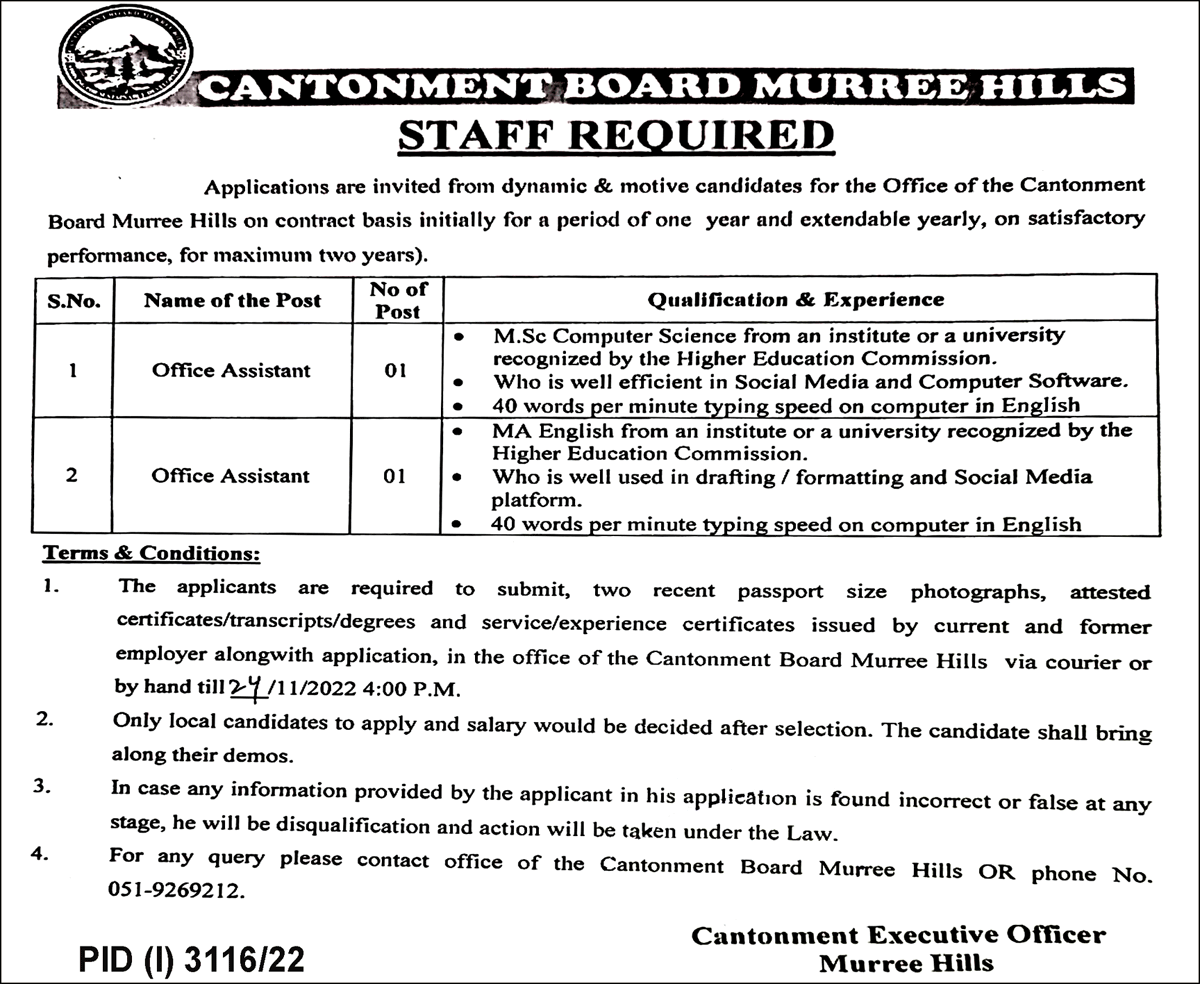 Cantonment Board Murree, murree Punjab Pakistan invites applications from eligible candidates for the post of office assistant as per advertisement of November 19, 2022 published in daily Nawaiwaqt Newspaper. Educational qualifications required Bachelor, MA and Master etc.