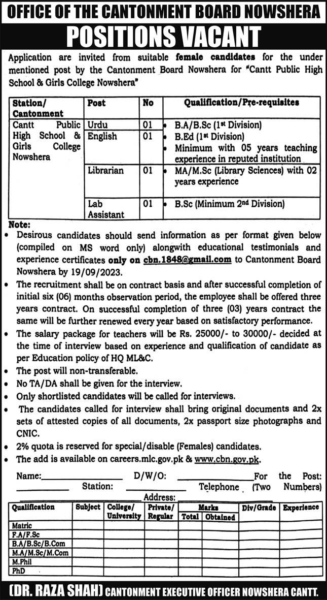 Vacant posts including lab assistant, english teacher, urdu teacher and librarian are announced in Cantonment Board Nowshera, nowshera Khyber Pakhtunkhwa KPK Pakistan as per 9 September 2023 advertisement in daily Express Newspaper. Persons with MS, BA, Master and Bachelor etc. education can apply.