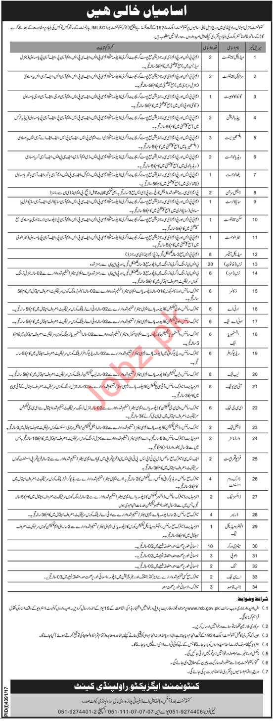Cantonment General Hospital Rawalpindi, Government of the Punjab required candidates for the posts of Medical Specialist (MBBS, FCPS, MCPS, MRCP, FRCP), Surgical Specialist (MBBS, FCPS, MCPS, MRCS, FRCS), Gynecologist (MBBS, MCPS, FCPS, MRCO, FRCO), Paiedrations (MBBS, FCPS, MCPS, MRCP, FRCP), Anesthesiologist (MBBS, FCPS, MCPS, MRCA, FRCA), Radiologist (MCPS, FCPS, M Phil, MRCP Path, FCPS Path), Pathologist, Dental Surgeon (BDSC), Psychiatrist, Skin Specialist, Nephrologist, Medical Officer, Female Nurse (BScN), Dispenser, OTA, OTA Tech, Anesthesia Tech, Radiographer, Lab Tech, ICU Tech, ECG Tech, Dental Tech, Wardmaster, Physiotherapist, Darkroom Assistant, Dialysis Tech, Electromedical Tech, Sanitary Worker, Dhobi, Cook, AC Tech and Naib Qasid.